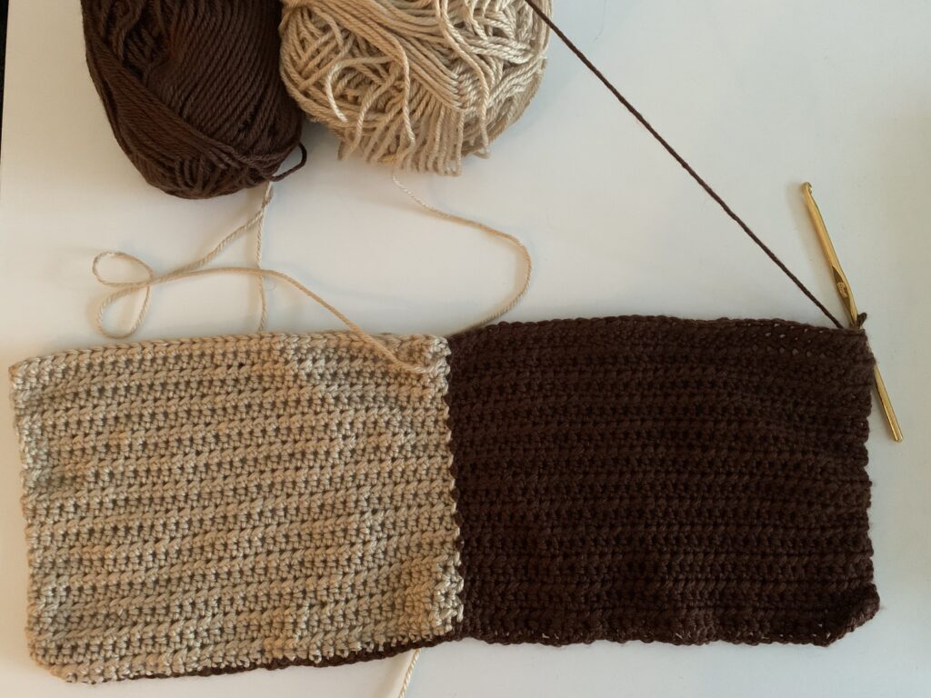 So far, I have completed the bottom half of the front piece of the vest. I am about to switch the colours, so that now the lighter brown is on top of the dark brown area, and vice-versa. Once I am done that, my next step is to just repeat the steps I have done, and create the back piece. Then, once I have the front and the back piece, I make the ribbing at the neck, sleeves, and bottom of the vest, and connect the two pieces together.