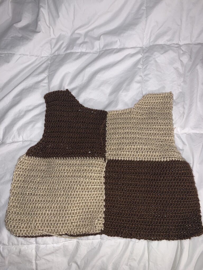 I’m very excited about this project so far, especially because I learned how to decrease stitches when crocheting! Decreasing is necessary in order to give a piece of clothing shape. If I didn’t decrease while making this, it would basically be a box without any curves for my arms or neck. This was an interesting process and I’m glad I learned how to do it!